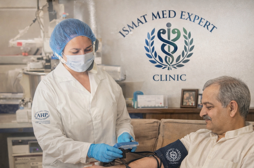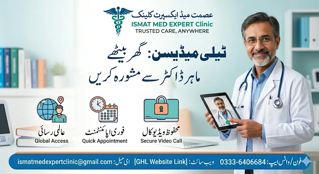 Skip the long queues, traffic, and waiting rooms! With Ismat Med Expert Clinic, professional medical advice is now just a click away. Book your online appointment and consult with our expert doctors from the comfort of your own home. We prioritize your health and convenience, providing high-quality healthcare at your fingertips."